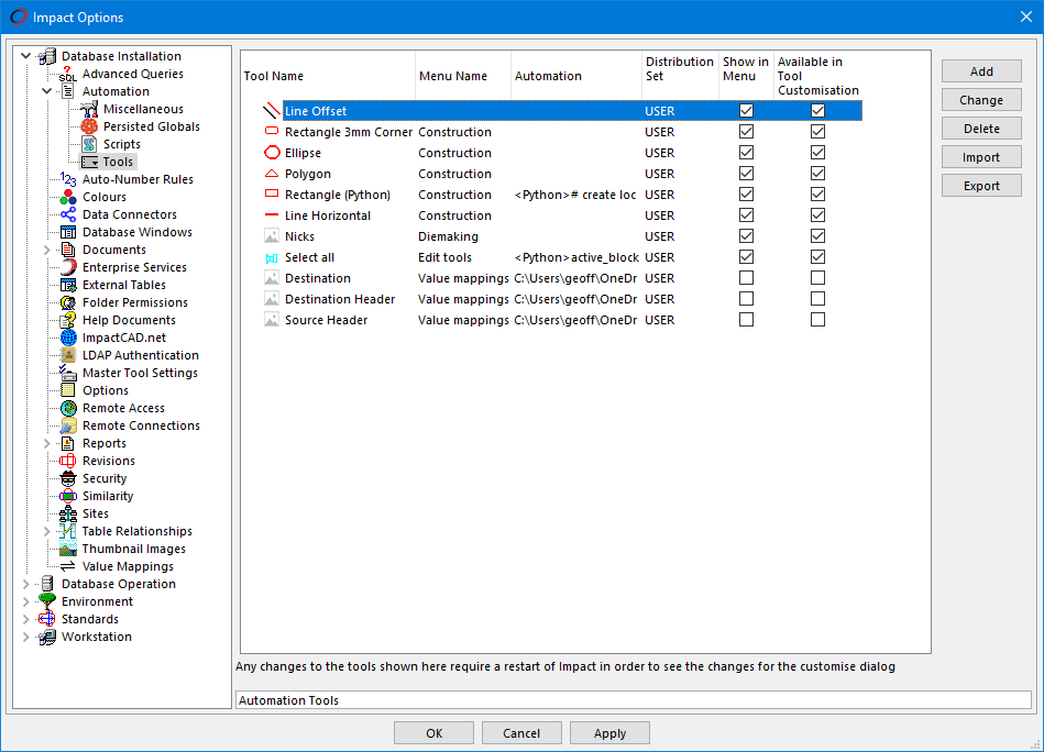 This page allows you to manually add/modify custom tools. These tools can be displayed in the Automation menu and/or added to the toolbar using the Customise tool.