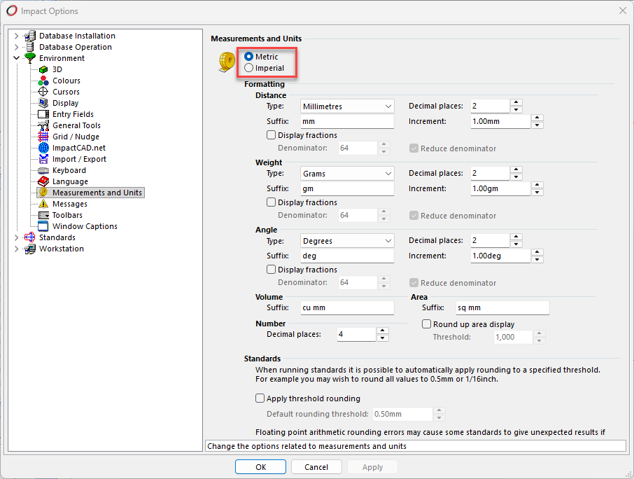 Impact supports multiple unit types and lets you switch between Metric and Imperial units at any time.